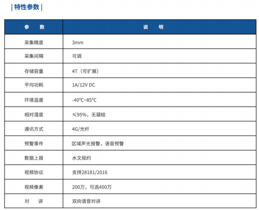 支持雨量/水位/流量/等数据的实时采集,远程配置,数据异常处理,传感异常分析,》支持8路网络摄像机对接/视频实时监控/4T本地存储/远程实时调看视频,解决视频无线传输流量大的问题。